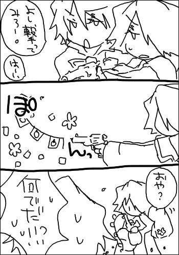 PAGE | 36 37 38 39 40 41 42 43 44 45 46 | ADMIN | WRITE 2009.04.25 Sat 21:47:39 苦手なものって2009.04.25 Sat 20:56:40 本気で惚れた何だか久しぶりにまともにギルを描いた気がする。殴り書きだけど カッコよくかつヘタレに描けるようになりたいです 4話のブレイクたんのドSっぷりに本気で惚れた アニメの現時点で総攻に君臨出来ると思った やっべー素敵すぎる そんでもって何度見返してもあれですね ブレイクたんの上着は分離してますね あ、あれですか、あれ あんまり気合い入れ過ぎちゃったもんだから袖が千切れたとかそういうのですか そうだったら後で鴉に縫ってもらえば良いと思うよ! 『鴉、ここ破れたんで縫って下サイ』 「は?何で俺が・・・」 『何か言いましたカ?』ニッコリ 「なんでもありませんっ」ガタガタ みたいな・・・ 今こんなけ攻なブレイクたんもあと何週か後のヴィンスたま登場の回では受々しくなってるんだろうなー とりあえず来週も楽しみだ! ++++ 白黒原稿はやる気が出ないよ拍手れす 2009.04.25 Sat 01:05:43 超萌える。2009.04.24 Fri 17:50:58 今年もキープ指は無事でしたが腕が筋肉痛になりました、ティアです ぼんそわーる でもあと何週かは指に危機が迫る予定なので気を抜かず切り抜けたいと思います。 何かあったら原稿ができないじゃないか!(そこかよ 笑。 そういえばこの間だ身体測定があったのですが。 何故か 縮んでました 身長が ちょ・・・ただでさえ低いのに減るとか・・・! っていうか身長って減るもんなんですか!? この調子で減っていってアリスより低くなったら泣きたいと思います。 でも視力は今年もキープできてました。 ティアさんいまのところ奇跡の2.0ですから 伊達以外の眼鏡はかけないぜ! でも来年辺りそろそろヤバそうです← ++++ 遅くなってごめんなさい拍手れす 2009.04.19 Sun 16:23:53 もにょもにょ喋る |