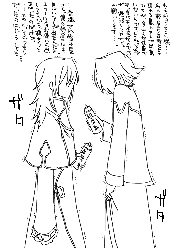 PAGE | 77 78 79 80 81 82 | ADMIN | WRITE 2008.03.31 Mon 19:38:29 そろそろそんな季節。一時休戦で協力して倒そうとするけれども失敗して、二人で体育座りしながら鴉の部屋の前で帰りを待っていればいい。 二人とも虫類全般が駄目だととて萌える。 最近はこんな妄想ばっかり。 +++ 今週のジャンプには萌死させられるかと思いました。 ちょっと、違う。 今週のブリーチに萌死させられるかと思いました。 そういえば、今週から過去編だったんですよ、ね! 何かいっぱい何処かで見た顔がいる! おかっぱロングさらさらストレートまっくす!!!(意味不明 春水さんがメガネっ娘好きだったり、卯ノ花隊長が浮竹さんや春水さんより古株だったり やっべ、何だこれは、ある意味今の一三番隊より萌えるじゃあない、か!! そんでもって、殆ど出てこなかったけどきました。 髭無しとぅるっとぅるな若店長が・・・!!! うわぁお一人称「ボク」だ★ ゆるっゆるです。いつ扇子が出てくるのか楽しみです(え、そんなとこ? しかしかわゆいなぁ超萌える・・・!!!ブリチでこんなに萌えたの藍染様の名台詞以来だ!! 来週は巻頭カラー!待ち遠しいな! ジャンプはいいな週1だから。 GFは月1だもん、ね! しかも来月はPH巻頭カラーだし・・・待ち遠しくて仕方がない! 早く18日に・・・そして早く5巻発売日に・・・!!!! +++ と い う か 明日から4月じゃあないです、か!!!!! 明日は例の日じゃあないですか!!!!! うっかり忘れてて何も準備してないべ!!!!! うわーうわーどうしよう。 本当に忘れてたから何も考えてない・・・;; ネタなんて、今本気で魔女っ娘しか思いつかない← くそう、さっきまでプラネットガーディアン読んでたせいか! いくらなんでもミニスカはまだ勇気が持てん!(そっちですか! 兎に角なんかネタ考えて超特急でどうにかしなければ・・・ あぁ、もう、あと4時間と30分程!どうにかしてや、る・・・ぜ・・・?(自信無 PR 2008.03.28 Fri 10:32:50 寒けれどもアイス。昨日の写真が何故かアプされてなくて悲しさ全開のティアです。おはよーございますー 昨日は、夜桜花見大会に行って参りました。 もう、咲いてるのかよ!とか思ってたのだけれども、4分咲きくらいのノリで結構咲いてました。 花見ですから、外でBBQやったんですが、 すっごい寒いんです いくら春ったって、夜はまだまだ寒いんですね!身をもって実感しました、よ!! 地味に凍死するかと思いましたもの。 しかも、まさかのアイスをデザートに選んでしまい、ますます凍死しそうでした、、、 なんやかんや言いつつもアイス食べてくれた皆さんに感謝です。 二人乗りをしようと思って乗る前に自転車が発進したり、スーパーで40分近く買い物してて家で準備組の方々から電話がかかってきたり、フランスパンが燃えてうっかり大惨事になりかけたり、茄が生だったりのハプニングの連続でしたよ、、、 夜は花粉が飛ばないようなので、お花見やるときは夜がいいです。ライトアップで綺麗だし、ね! 今度は城の方でお花見がしたい、です! +++ 昨日は素敵エチャがあったんですよ、ね・・・ 行きたかった・・・べ!or22 今日こそは・・・今日こそは行くんだ! +++ 昨日更新しようと思って出来なかったのでさっき更新してきました。 ヴィンブレ絵1枚と鴉←ブレまむがとそこはかとなくブレシャロな過去まむがと裏絵を・・・ 何だか私、すっごい頑張った感に溢れてますよ今! これも春休みのなせる技ですね・・・!!!4月入ってからはどうなることやら; ・・・トップはそのうち変えます・・・よ、ちゃんと そういえば昨日、恐怖の成績がお家にやって参りました。 フラ語が不可ってなかったので、万々歳です。 今回もセーフでした。・・・ふぅ どうやら次学校行くのは11日からのご様子。 でも、オリエンテーションなるものが9日に・・・。何故オリエンテーション; これ、行かないと不味いよなあ、きっと。 2008.03.27 Thu 20:26:11 夜桜ー夜桜花見大会中ー。